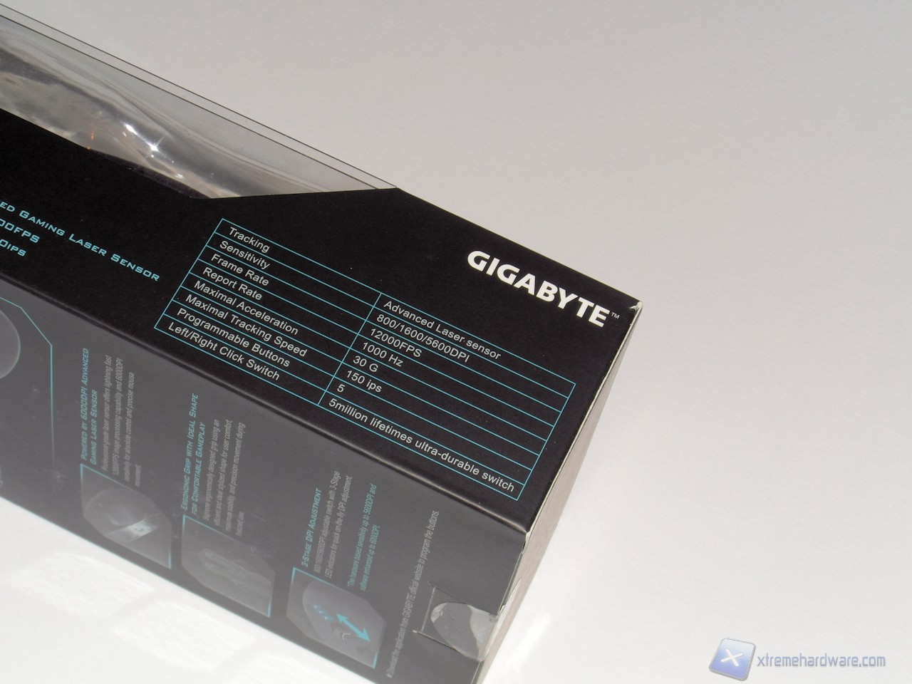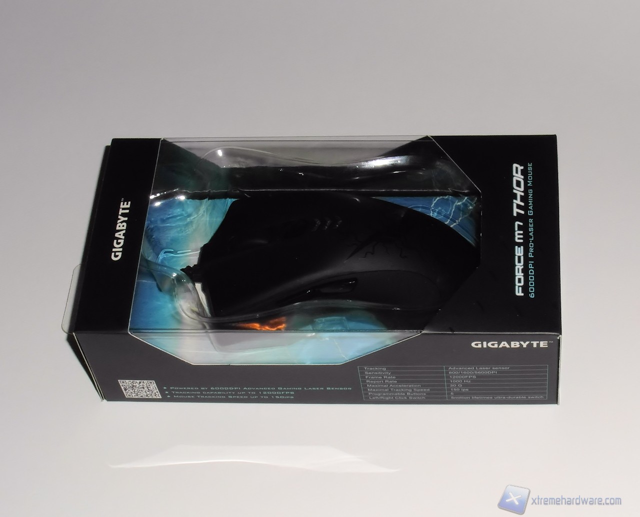 La confezione del Gigabyte Force M7 Thor è semplice e riprende lo stile adottato da molti produttori per i prodotti più disparati. La parte centrale della confezione è realizzata in plastica trasparente per permettere all'acquirente di visionarne il mouse contenuto, mentre il retro e parte dei lati sono realizzati in cartone di colore nero.