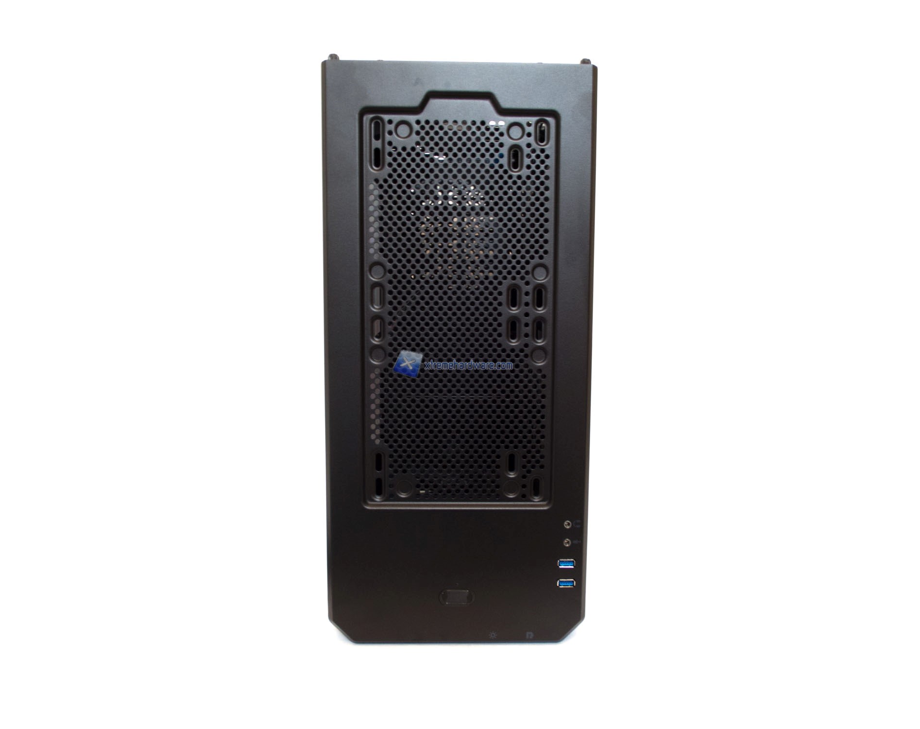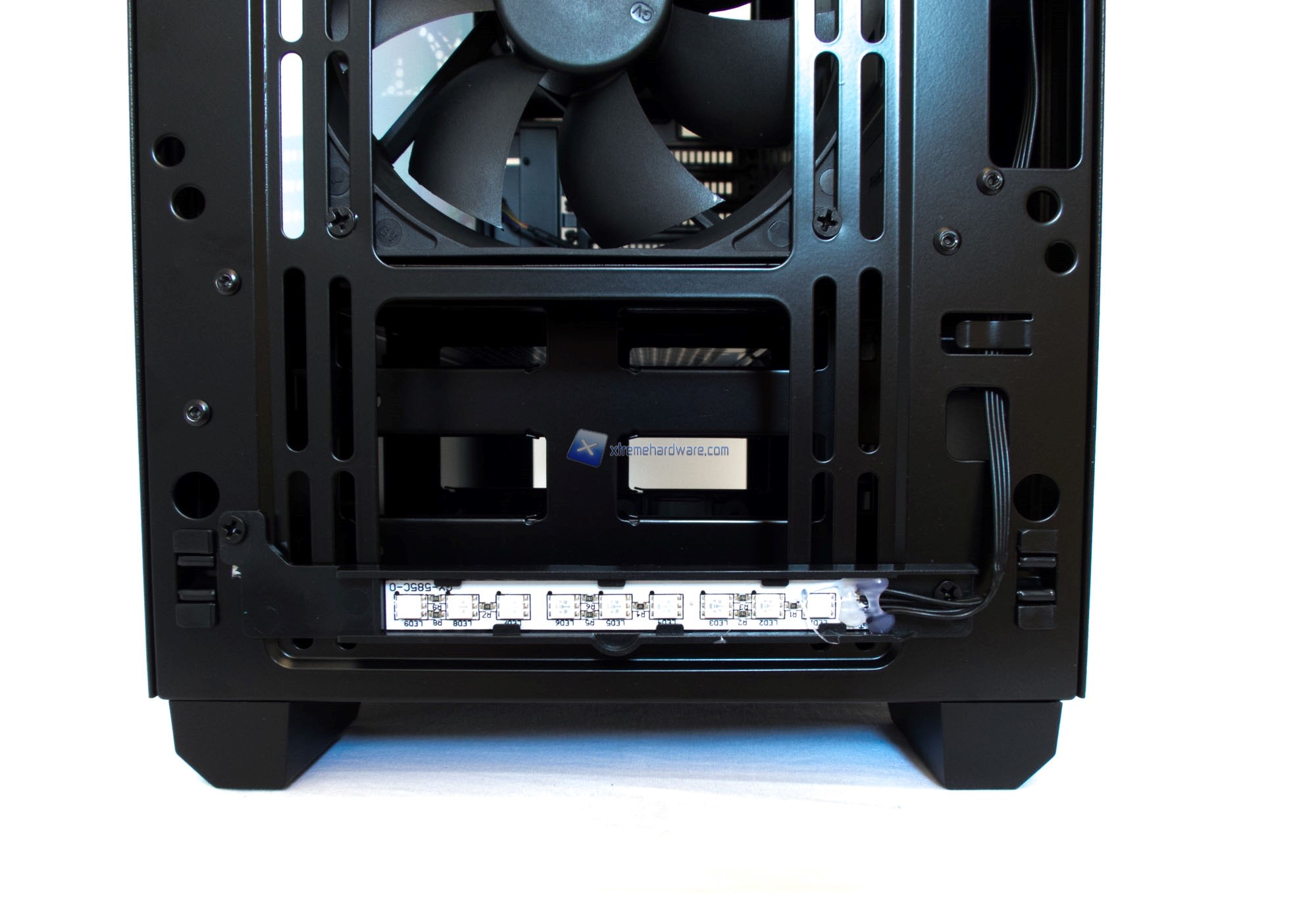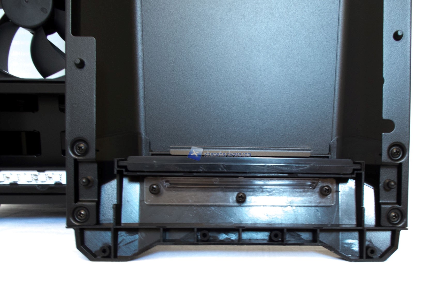 Infine, un dettaglio della struttura interna del frontale. Troviamo un supporto per ventole fino a 3x 120 mm o 2x 140 mm. Per i radiatori sarà possibile anche una configurazione Push/Pull.