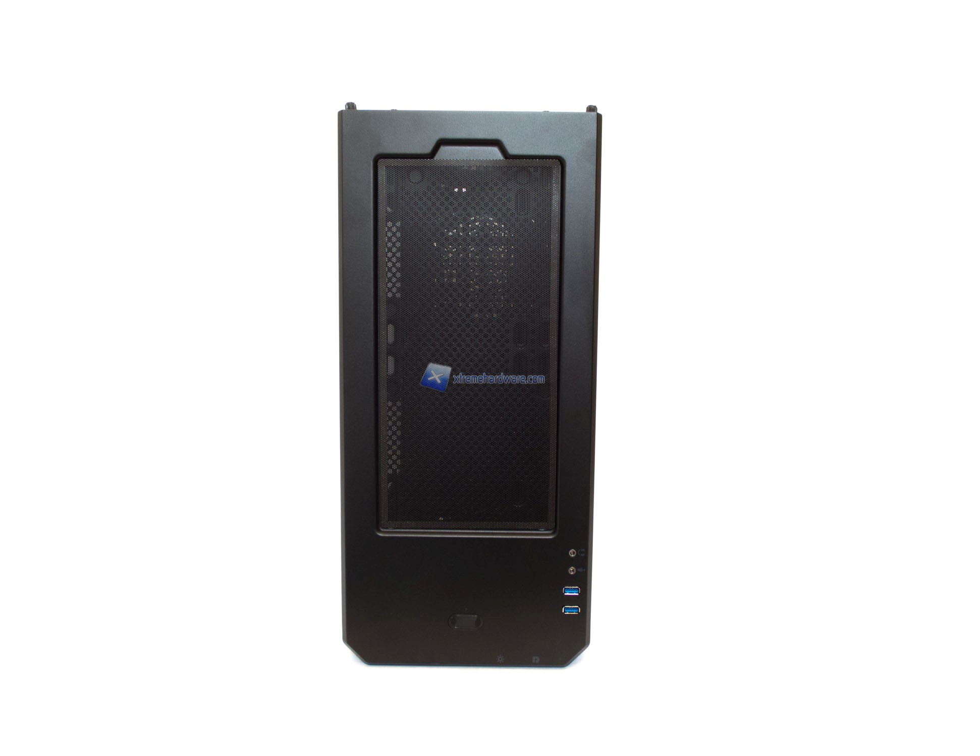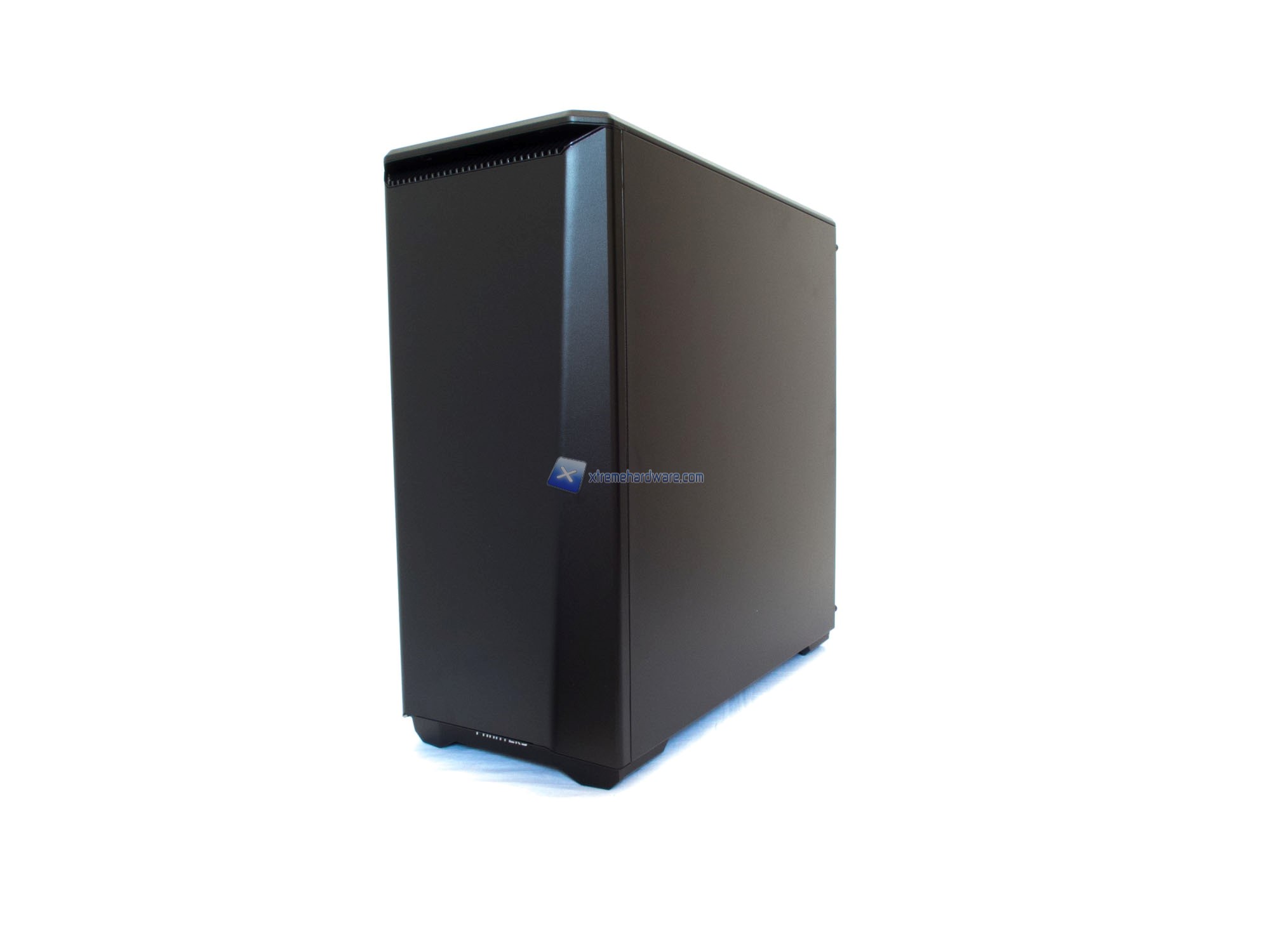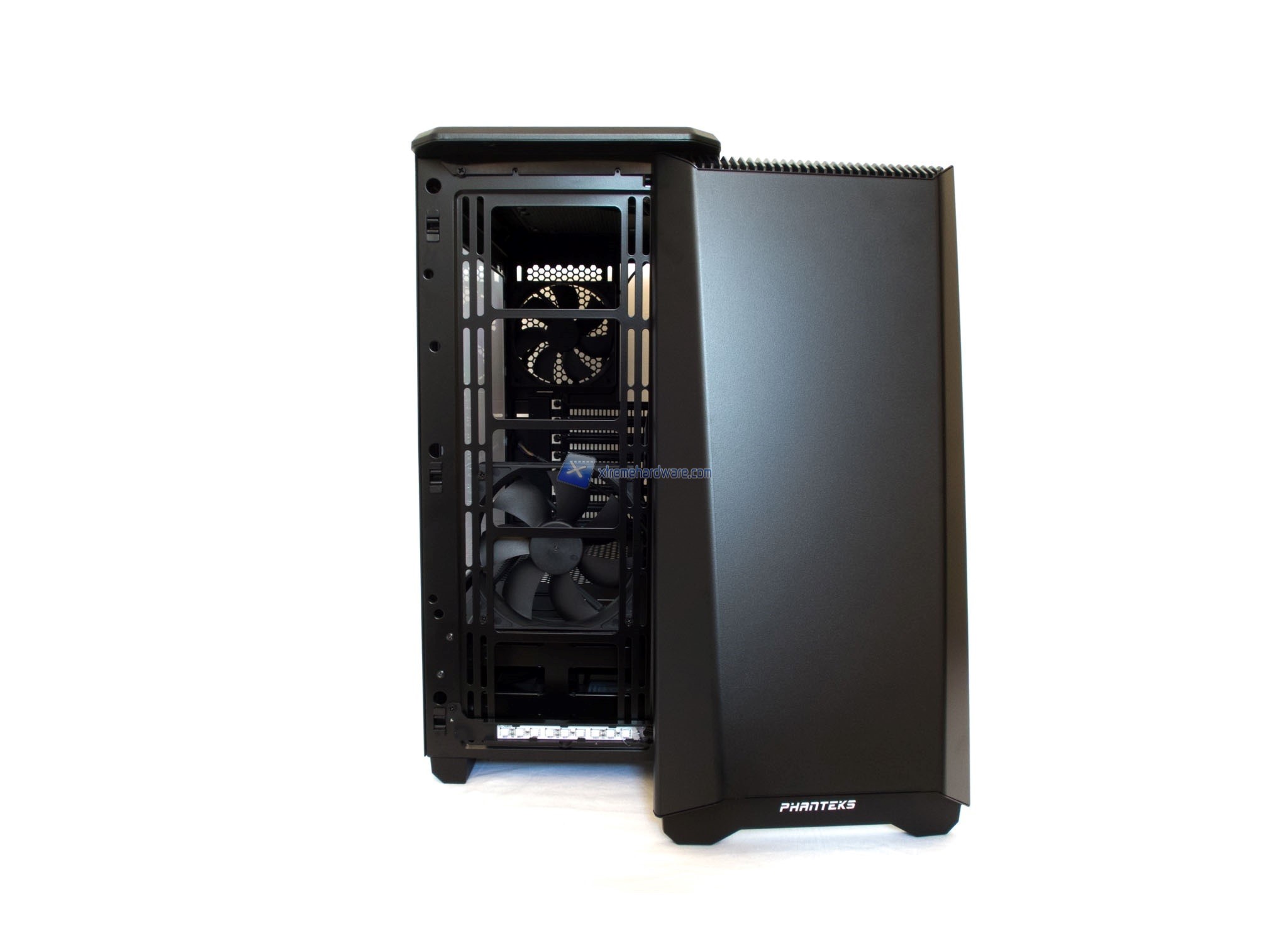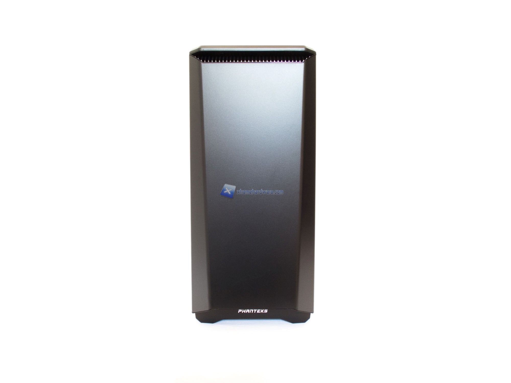 Partendo dalla paratia frontale osserviamo l’assenza di bay o griglie (frontali e visibili) come in altri case di moderna concezione. Questa paratia è realizzata in plastica di buona qualità e caratterizzata da una superficie quasi rugosa, con effetto a buccia d’arancia. La verniciatura dell’intero case è comunque soggetta al fenomeno del fingerprinting (comune a moltissimi case in commercio). La parte bassa del frontale si caratterizza per la presenza della scritta Phanteks che verrà irradiata dalla retroilluminazione di una striscia a LED posta dietro tale pannello. Striscia di tipo RGB con cui potremo variare l’illuminazione fino a 10 colori. Insieme a questa zona, anche quella in corrispondenza del tasto di accensione verrà retroilluminata dello stesso colore scelto. Spostandoci nella parte alta troviamo un design ancora più particolare e caratterizzato da più feritoie.
