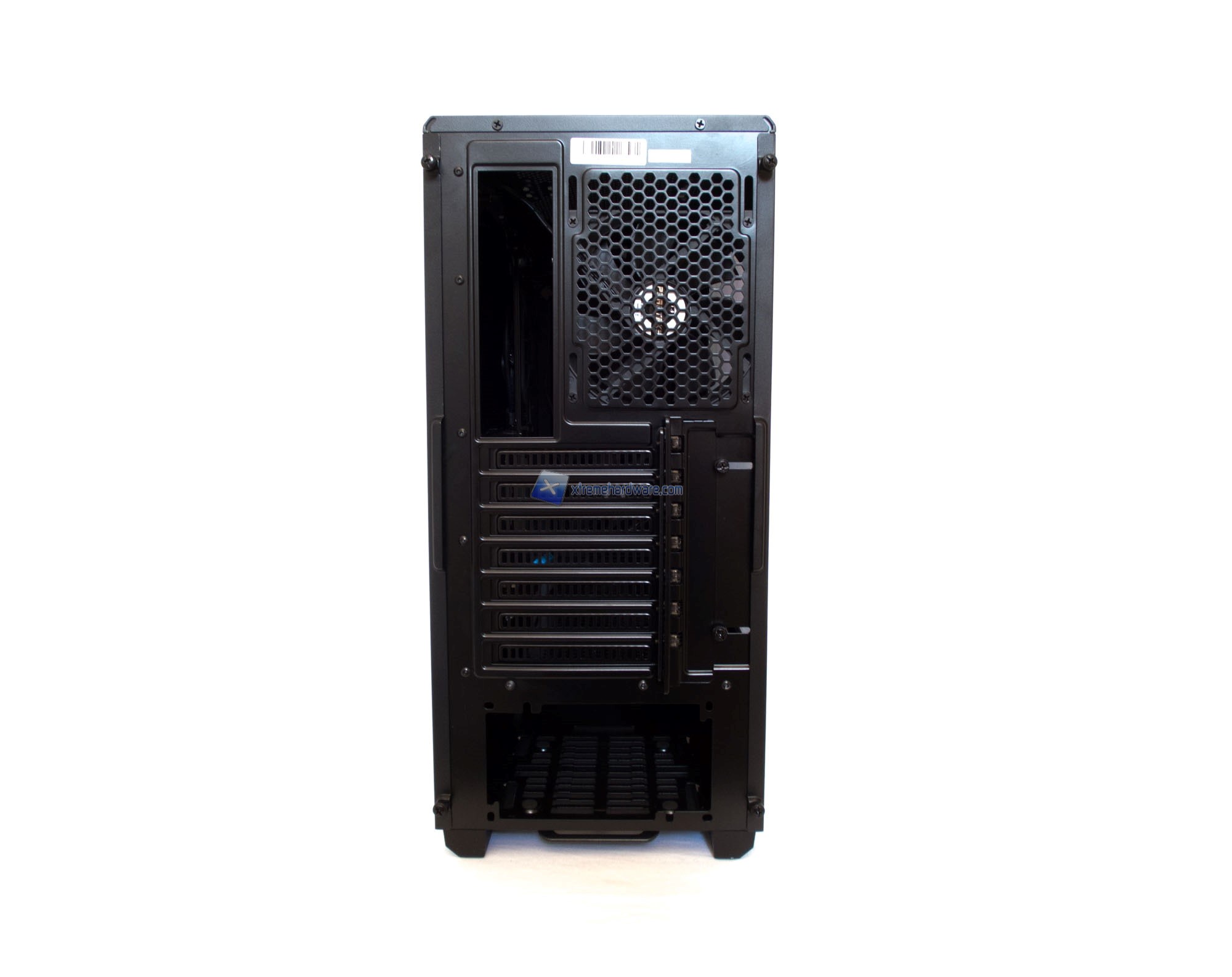 Passiamo ora al retro. Design e layout sono standard. Troviamo quindi il foro I/O Shield e una griglia con una ventola da 120 mm preinstallata (i fori non standard permettono di spostare di pochi mm in su o in giù il posizionamento della stessa) nella parte alta, per poi proseguire con 8 slot PCI-E e infine il foro per installare l’alimentatore.
