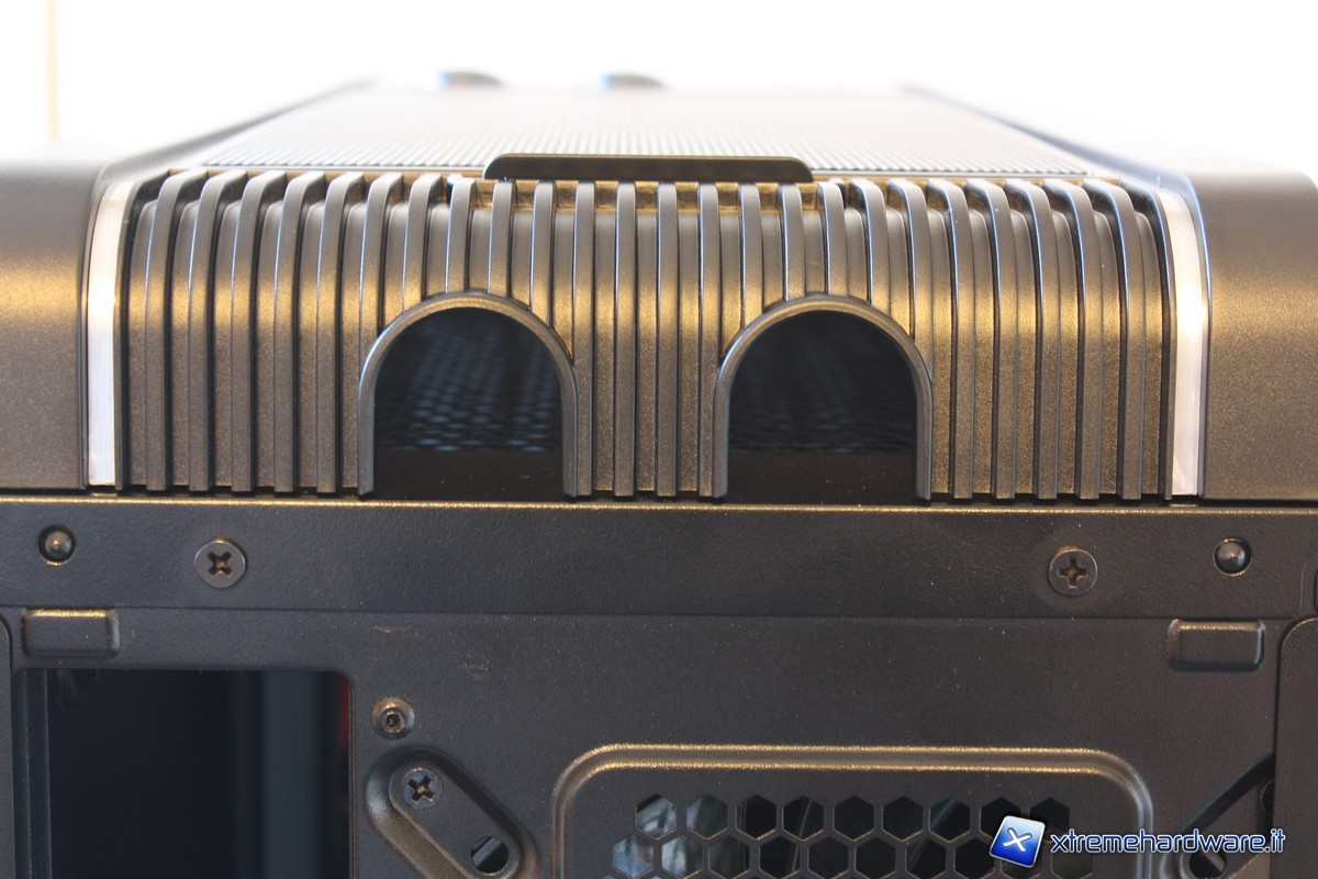 Questo prodotto è indirizzato sicuramente agli amanti del watercooling, lo testimoniano i 4 fori per il passaggio dei tubi, ma soprattutto l’aggiunta nella zona superiore di due fori in prossimità della paratia nel tetto del case. Potremo infatti indirizzare i tubi del radiatore in alto, attraverso le aperture presenti nel case