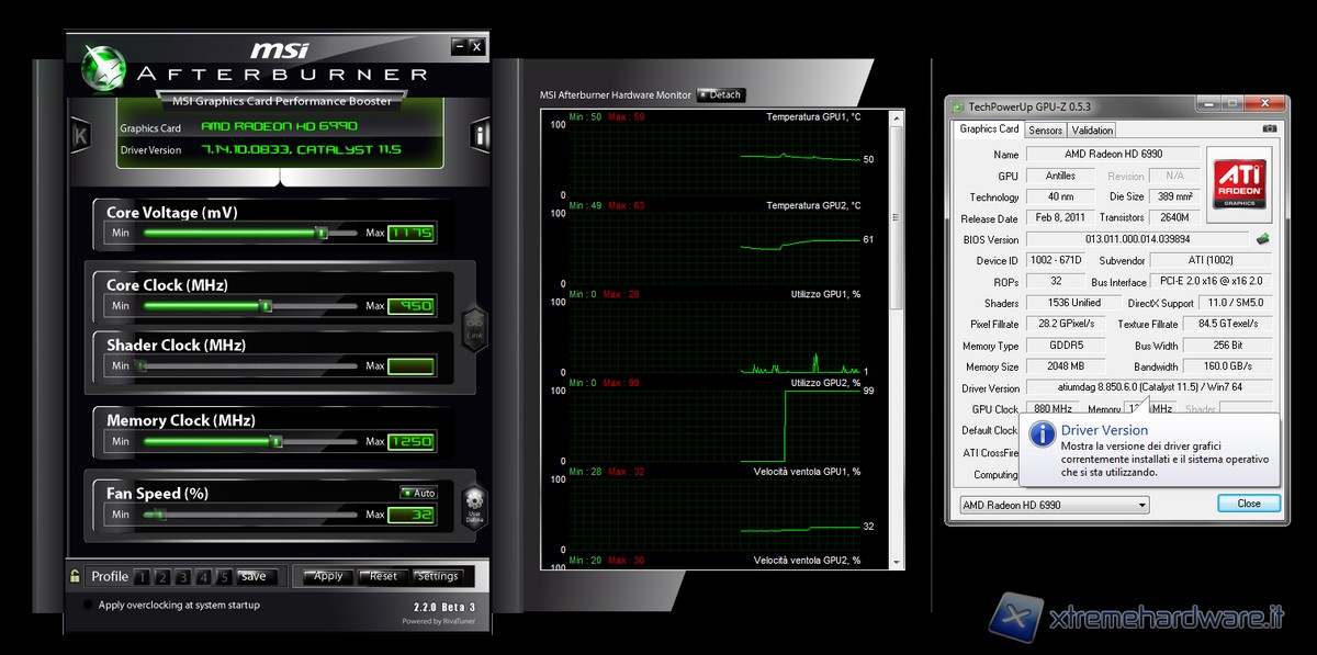 Dopo aver provato intensivamente questa scheda con tutti i giochi e i benchmark di rito, abbiamo voluto testare la HD 6990 cercando il massimo overclock possibile sempre con il suo dissipatore ad aria. Abbiamo utilizzato, per overcloccare la scheda, il software MSI Afterburn, le ultime versioni di questo programma permettono anche di modificare il voltaggio della gpu. Abbiamo impostata la modalità OC selezionando dal bios la modalità 2: