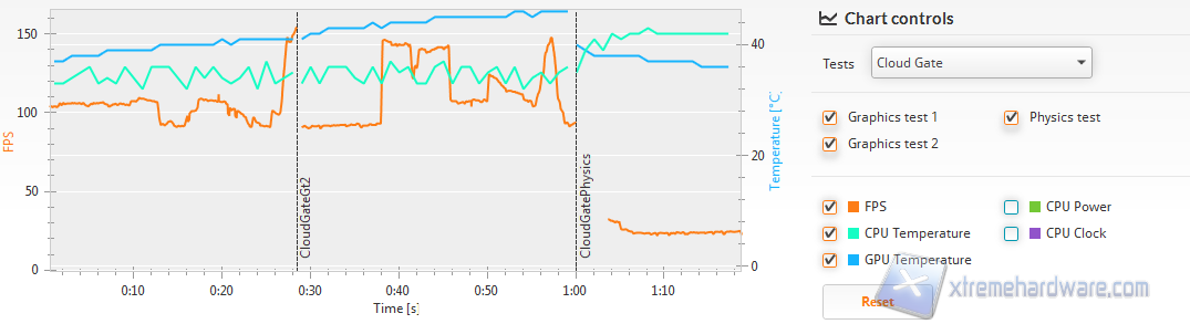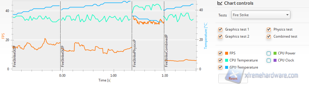 Nel grafico seguente abbiamo messo a confronto i dati riscontrati durante l'esecuzione di 3D Mark Fire Strike sia con le impostazioni di base che con quelle per l'overclock daily use, come si può notare, la linea blu più marcata, inerente alla temperatura d'esercizio della scheda video in overclock, fa registrare addirittura temperature inferiori rispetto a quella più opaca registrata durante il test a frequenze base. E' molto interessante notare come la differenza tra le due impostazioni sia più marcata nei primi due test che non sfruttano la fisica hardware.